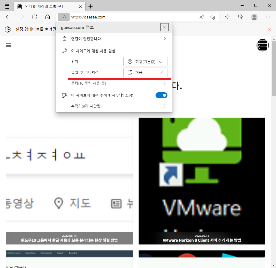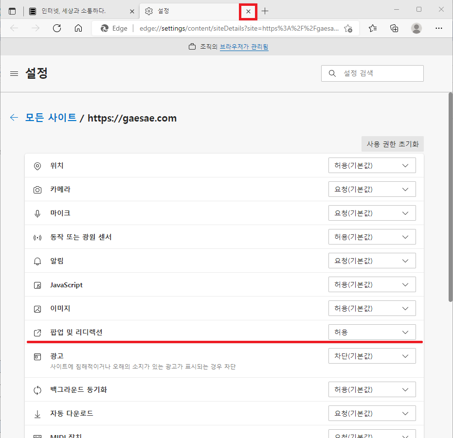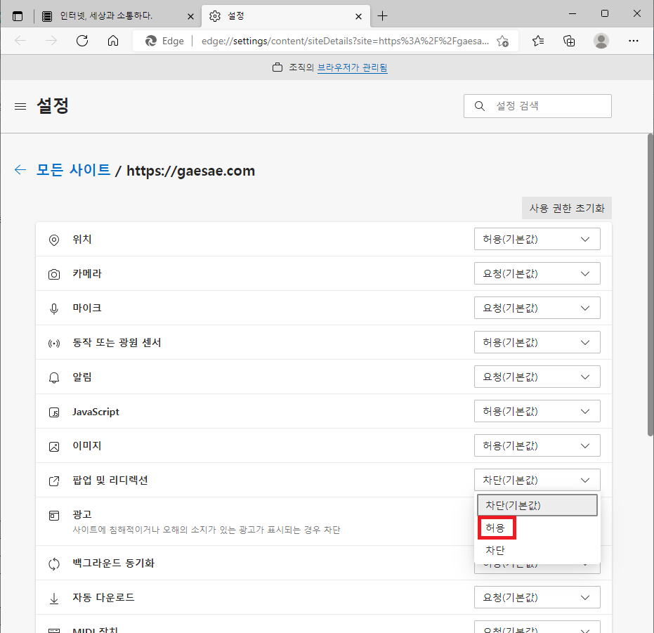 엣지 브라우저 특정 사이트 팝업 해제하기
