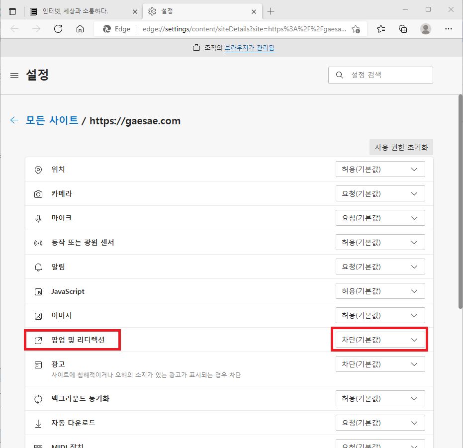 8. 사용권한 쪽에 팝업 및 리디렉션이 추가되었다면 정상적으로 팝업창이 허용된 것 입니다.