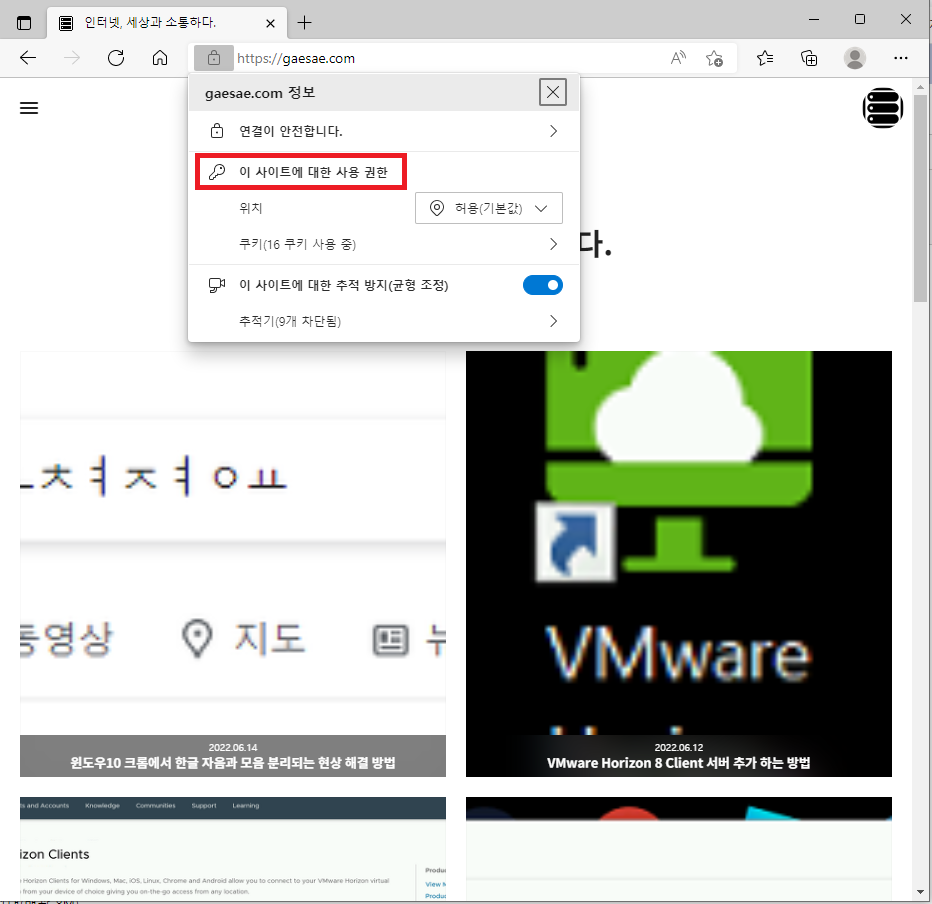 3. 자물쇠 버튼을 클릭하면 엣지 브라우저의 해당 사이트에 대한 설정 정보가 나옵니다.