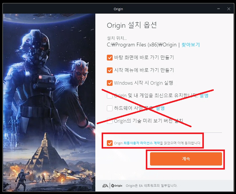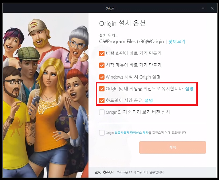18. 세 항목을 비활성화하셨다면 하단 Origin 최종 사용자 라이선스 계약을 읽었으며 이에 동의합니다에 체크하고