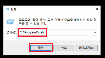 8. 실행창을 여셨다면 C:\ProgramData\ 를 입력하고 확인을 눌러줍시다.